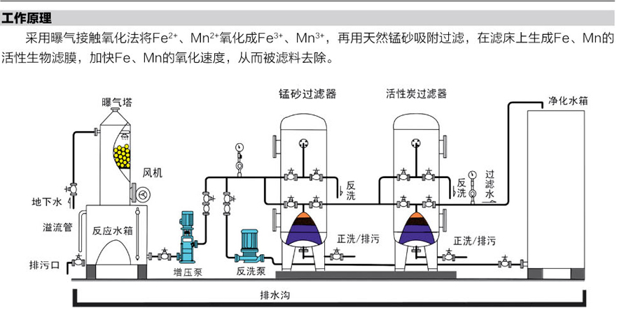 除鐵錳過濾罐是通過均質(zhì)等粒徑錳砂形成砂床,作為過濾載體從而進行立體深層過濾。其過濾精度視砂粒大小而定。過濾時:水從罐體上部的進水口流入,通過砂石介質(zhì)層孔隙向下運行滲透,雜質(zhì)被隔離在砂石介質(zhì)層上部。過濾后的凈水經(jīng)過過濾器底部的過濾元件進入出水口流出,即完成水的過濾過程。如果處理水量較大,應多臺并聯(lián)使用??蛇^濾綠藻、漂浮物等。。